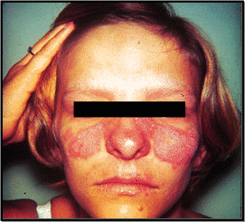 в виде васкулитной "бабочки" - нестойкого разлитого покраснения с ци- анотичным оттенком в средней зоне лица, усиливающегося при волнении, воздействии инсоляции и др.