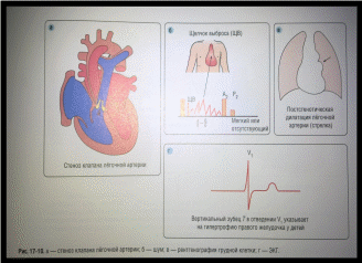 2) смешанная-в ответ на гиперволемию возникает защитный рефлекс — спазм легочных сосудов, сопровождающийся повышением давления в легочной артерии и увеличением легочного сопротивления, что способствует уменьшению лево-правого сброса крови (у детей старше 3 лет развиваются органические обструктивные изменения в легочных сосудах);