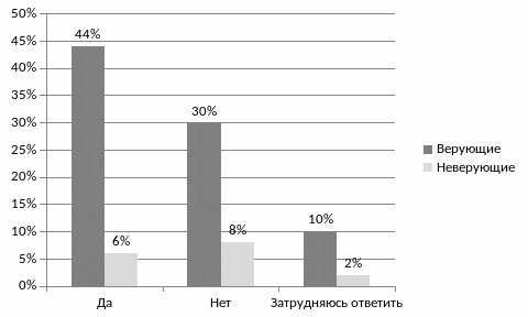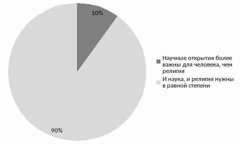 Только 10% респондентов считают, что наука более важна для общества, чем религия. В эту группу попали только неверующие респонденты. 90% опрошенных считают, что религия и наука равноважны для человека. Некоторые неверующие также считают, что религия необходима, т.к. выполняет ряд важных функций в жизни общества. Верующие же также считают науку полезной и важной. Такое распределение ответов отражает социальный статус респондентов, которые являются студентами, т.е. людьми, в жизни которых наука занимает важное место. Ни один из респондентов не ответил, что религия для человека важнее, чем наука, что говорит о потере религией доминирующей роли в сознании современной молодежи.