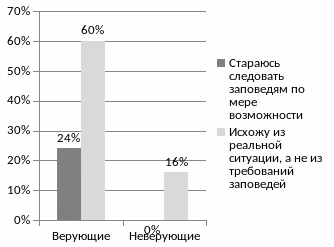 Большая часть респондентов (76%) свое поведение выстраивает исходя из реальной ситуации, а не из требования заповедей. В эту группу попали все респонденты, назвавшие себя атеистами, а также более половины (71%) из числа верующих, что можно считать признаком формальной религиозности в их поведении. Только 24% опрошенных ответили, что стараются следовать заповедям по мере возможности, это можно расценивать как достоверный признак их религиозности. Постоянное следование религиозным заповедям не свойственно для современных молодых верующих, так не ответил ни один из респондентов.