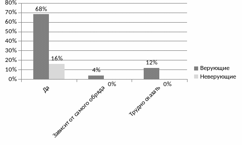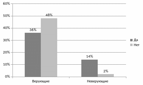 Большая часть респондентов совершает молитву только находясь в критической жизненной ситуации. Такой вариант ответа выбирали в основном православные респонденты. Однако можно ответить интересный факт, что 37,5% неверующих респондентов так же молятся в критической ситуации. Этот факт также можно расценивать как говорящий о формальной религиозности ответивших подобным образом. В критической ситуации молитва осуществляется неосознанно, на всякий случай, можно даже сказать машинально. При отсутствии идентификации себя с религиозной культурой, такое поведение можно расценивать как подражание поведению или даже просто лингвистическим формулам окружения.