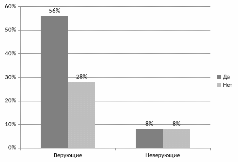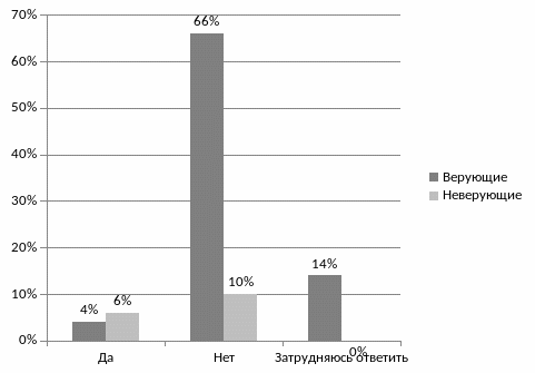 Абсолютное большинство респондентов в переселение душ не верят. Но и среди верующих, и среди неверующих нашлись респонденты, которые дали положительный ответ на этот вопрос. 17% опрошенных затруднились ответить. В эту группу попали только верующие респонденты.