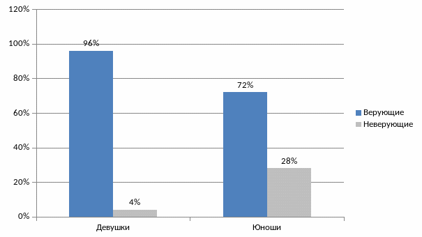 Причем, можно отметить, что среди юношей респондентов, определивших себя как неверующие, гораздо больше, чем среди девушек: соответственно 28% и 4% всех опрошенных обоего пола.
