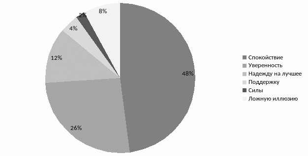 Чтобы определить, какая функция религии реализуется в современном мире больше, респондентам было предложено продолжить фразу: «Религия дает человеку…». Были получены следующие результаты: