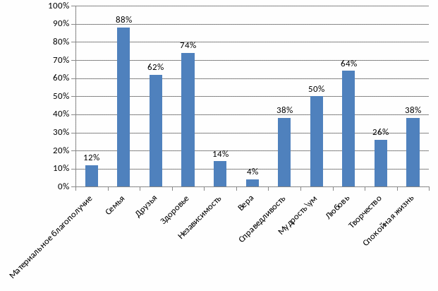 В качестве приоритетных ценностей респонденты в основном выделяют материальные, такие как здоровье, семья, друзья и т.д. Лишь у 4% опрошенных вера выступает как ценность.