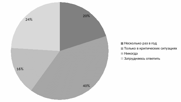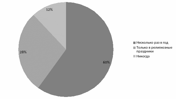 Ни один из респондентов не ответил, что посещает церковь один раз в неделю или даже один раз в месяц. Большинство опрошенных (60%) посещают церковь несколько раз в год. Богослужения и религиозные праздники посещаю 28% респондентов, в их числе опрошенные мусульмане. Это может быть связано с тем, что эта группа верующих не имеет возможности посещать мечеть чаще, поскольку их мало в регионе. Так же в числе респондентов, посещающих церковь по праздникам, оказались 50% опрошенных, назвавших себя атеистами. Возможно, этот факт объясняется наличием определенных правил и традиций в их семьях и ближайшем окружении, которые навязываются и им. Этот фактор можно считать свидетельством формальной религиозности, поскольку респонденты себя как верующих не идентифицировали.