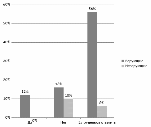В жизнь после смерти верят лишь 12% опрошенных, причем все они относят себя к верующим. 26% отрицательно ответили на этот вопрос. В эту группу попали как неверующие респонденты, так и верующие. Подобным образом ответили 19% от числа всех верующих респондентов, что можно отнести к проявлению формальной религиозности, как несоответствие с основными религиозными верованиями. Большинство опрошенных затруднились ответить на данный вопрос. Такой ответ давали как неверующие, так и верующие молодые люди (так ответили 66% от всех верующих респондентов), что может говорить о неопределенности их мировоззрения. Определенного мнения на этот счет большинство молодых людей не имеет.