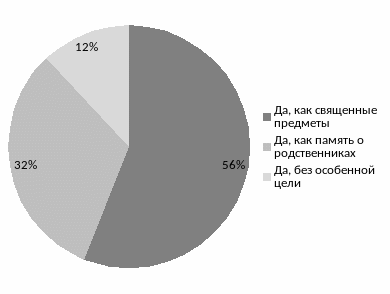 На вопрос «Хранятся ли в Вашем доме предметы, которые имеют отношение к религиозному культу?» все без исключения респонденты ответили положительно. Даже в современном мире сложно встретить человека, у которого в доме абсолютно отсутствовали бы такие предметы. Однако, существенно различаются мотивы их хранения.