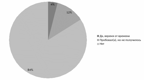 Соблюдают посты время от времени только 4% опрошенных, причем так ответили только те, кто придерживается мусульманского вероисповедания. Можно предположить, что отсутствие постоянно соблюдающих все посты среди респондентов объясняется их социальным положением. Все опрошенные – студенты, это затрудняет строгое следование всем религиозным нормам.