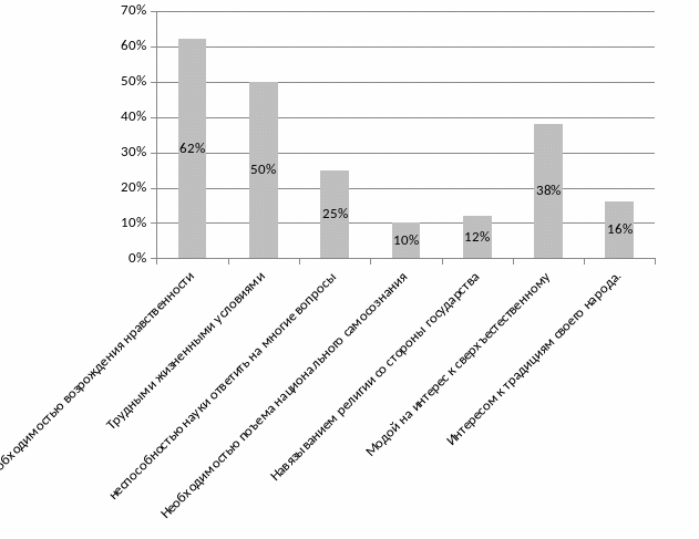 Так же респонденты обуславливают процесс возрождения религиозности неспособностью науки ответить на многие вопросы (25%), интересом к традициям своего народа (16%), навязыванием религии со стороны государства (12%) и необходимостью подъема национального самосознания (10%).
