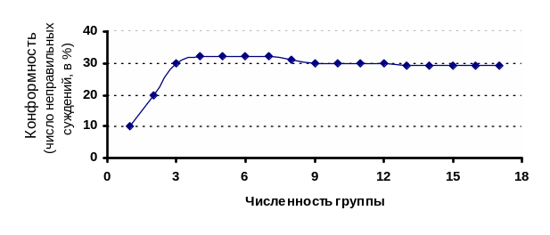 Соломон Аш (Asch, 1955) экспериментально определил степень конформности293. Она быстро возрастает при увеличении числа членов группы до трёх, а начиная с четырёх – не растёт, а даже несколько снижается: