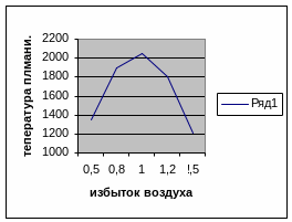 Температура пламени в зависимости от избытка воздуха, максимум при равном-1.