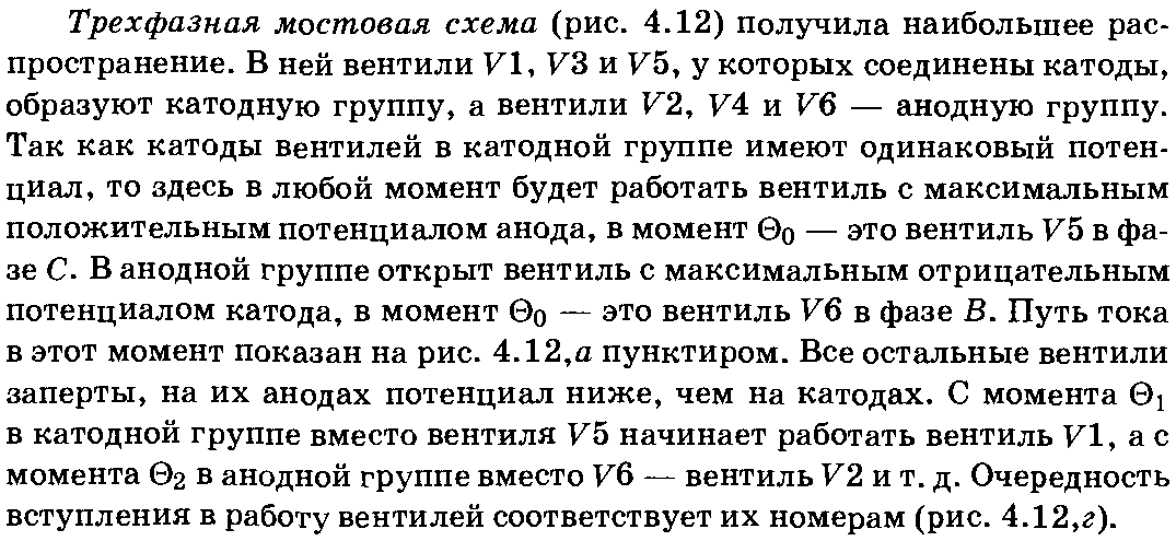 Перегрузки по напряжению возникают на вентилях в переходных процессах: при переходе от прямого включения вентиля к обратному, при коммутации тока с одного вентиля на другой, при переходе выпрямителя от режима нагрузки к холостому ходу. Гораздо более опасное перенапряжение наблюдается при переходе от режима короткого замыкания к холостому ходу, поскольку при этом в цепях трансформатора возникает самая большая ЭДС самоиндукции, вызванная спадом тока. Перенапряжение может достигать Uобр=(1,5-2)Uх. Для снижения перенапряжений параллельно вентилю подключают конденсатор (рис. 7.4,6). Импульс ЭДС самоиндукции вызывает появление тока через конденсатор. Поскольку сопротивление конденсатора импульсному току невелико, то и падение напряжения на таком шунтирующем конденсаторе меньше, чем на вентиле без конденсатора. В результате и на вентиле импульс напряжения в обратном направлении также снижается на 20-30%. Для ограничения тока в цепи конденсатора последовательно с ним соединяется резистор. RС-цепочки включают параллельно или каждому плечу выпрямительного блока или вторичным обмоткам трансформатора.