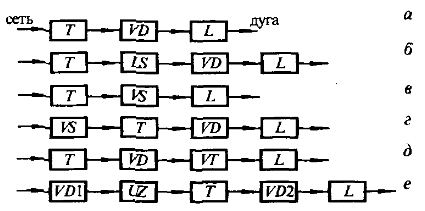 По конструкции силовой части выпрямители можно разделить на шесть групп (рис. 7.1). Более ранняя и простая конструкция у выпрямителя, регулируемого трансформатором (рис. 7.1,а). Его силовая часть состоит из трансформатора Т, выпрямительного блока VD на неуправляемых вентилях и сглаживающего дросселя L. Трансформатор в такой схеме используется для понижения напряжения, формирования необходимой внешней характеристики и регулирования режима. Некоторое применение нашел выпрямитель с дросселем насыщения (рис. 7.1,6). Дроссель насыщения LS применяют для формирования внешней характеристики и регулирования режима. Более совершенны и распространены тиристорные выпрямители (рис. 7.1 ,в). Тиристорный выпрямительный блок VS за счет фазового управления моментом включения тиристоров обеспечивает регулирование режима, а при введении обратных связей по току и напряжению — также и формирование любых внешних характеристик. Иногда тиристорный регулятор VS устанавливают в цепи первичной обмотки трансформатора Т (рис. 7.1,г), тогда выпрямительный блок VD Может быть собран из неуправляемых вентилей — диодов. Транзисторный регулятор VT, наоборот, устанавливают в цепи сварочного тока (рис. 7.1,д), с его помощью легко реализовать программное управление процессом сварки. Оригинальна схема инверторного источника (рис. 7.1,е). Инвертор UZ преобразует постоянное напряжение выпрямительного блока VD1 в высокочастотное переменное, которое затем понижается трансформатором Т и выпрямляется блоком VD2. Воздействуя на параметры инвертора, регулируют режим и формируют внешние характеристики выпрямителя. В состав любого выпрямителя входят также вентилятор, пускорегулирующая и контрольная аппаратура. Тиристорные, транзисторные и инверторные выпрямители имеют более сложные схемы управления с цепями формирования управляющих сигналов и обратных связей.