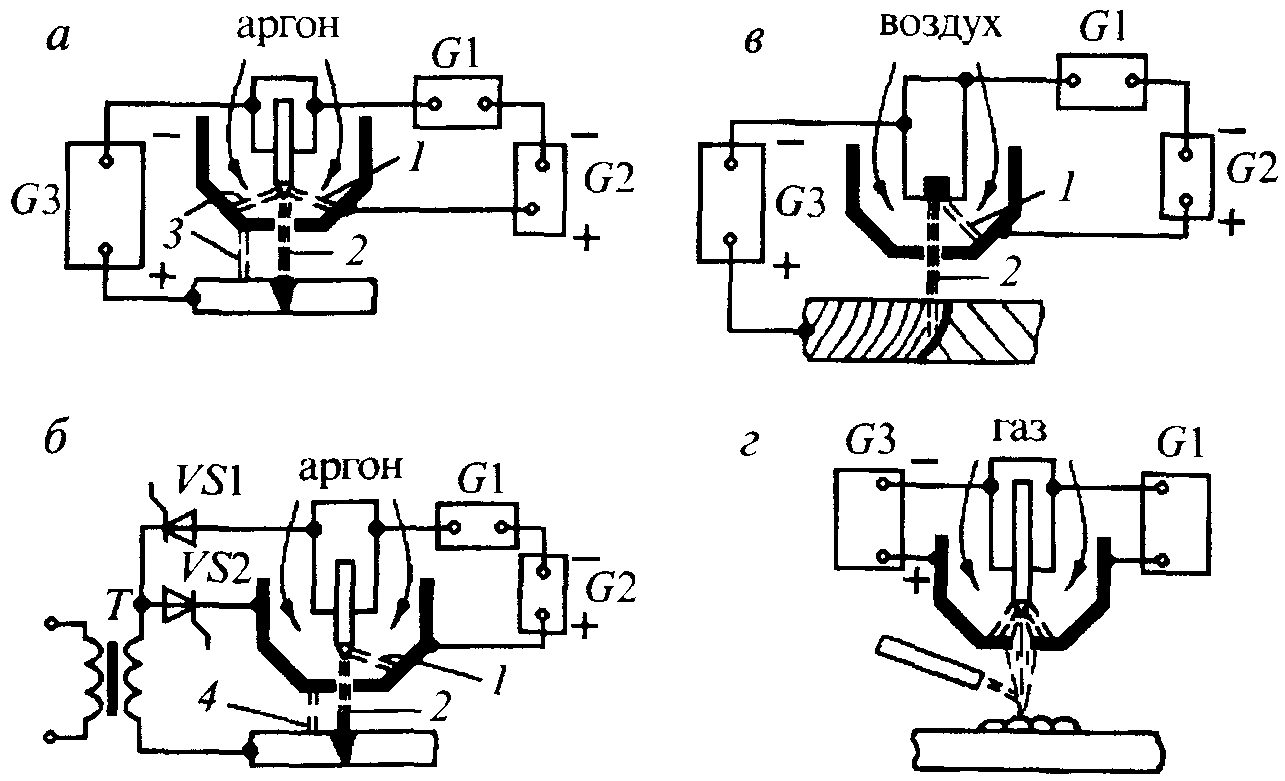 Рис. 6.18. Схемы плазменных процессов: а — сварки на постоянном токе, б — сварки на переменном токе, в — резки, г — напыления