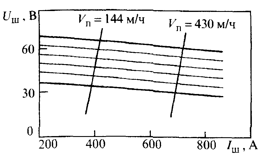 Поскольку при реальном процессе электрошлаковой сварки расстояние непостоянно, то в практике настройки режима статическая характеристика не используется. Реальная связь тока и напряжения отражается так называемой вольт-амперной характеристикой устойчивой работы, получаемой при постоянной скорости подачи VП электродной проволоки. В этом случае при увеличении напряжения источника, а следовательно и Uш , возрастает тепловая мощность ванны и ее температура ТШ. В результате электрод плавится быстрее и погружается в ванну на меньшую глубину, что приводит к увеличению расстояния lШ, а следовательно, и увеличению сопротивления шлаковой ванны RШ. Поэтому увеличение напряжения источника почти не сопровождается ростом тока — вольт- амперная характеристика устойчивой работы UШ = f(IШ) при постоянной скорости подачи проволоки почти вертикальная: