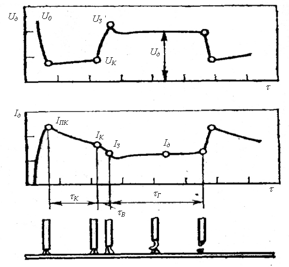 Надежное возбуждение дуги связано также с оптимальной скоростью нарастания тока короткого замыкания в начальный момент до пикового Iпк , а затем до установившегося Iк значения. При больших скоростях нарастания тока короткого замыкания наблюдается взрывной характер оплавления электрода; при малых скоростях затрудняется образование ионизированного промежутка между электродом и свариваемым изделием.