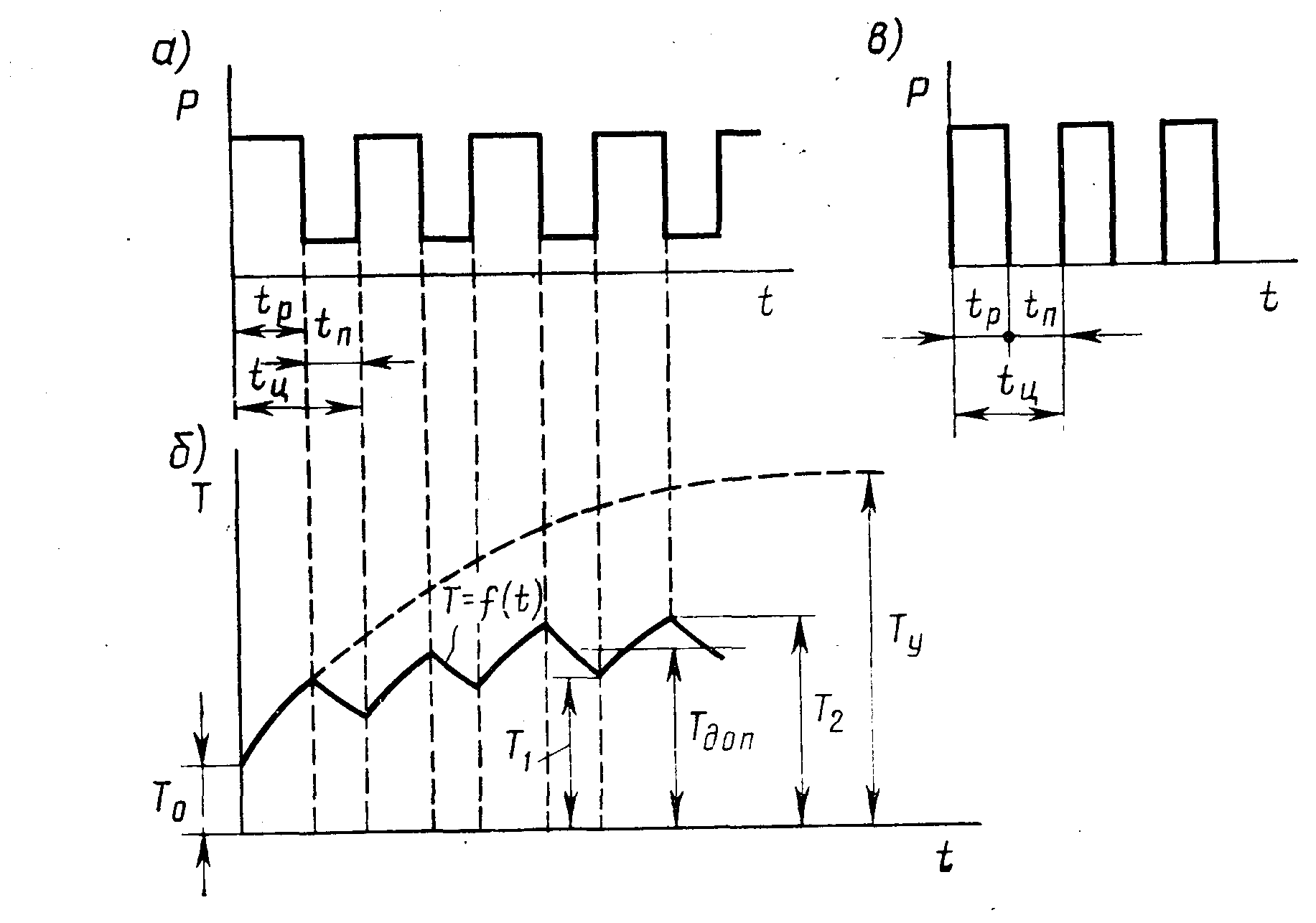 Перемежающийся режим характерен тем, что время tp работы (сварки) чередуется со временем перерывов работе tn (пауз). На рис. 4.9, а дан график изменения нагрузки во времени при перемежающемся режиме работы.