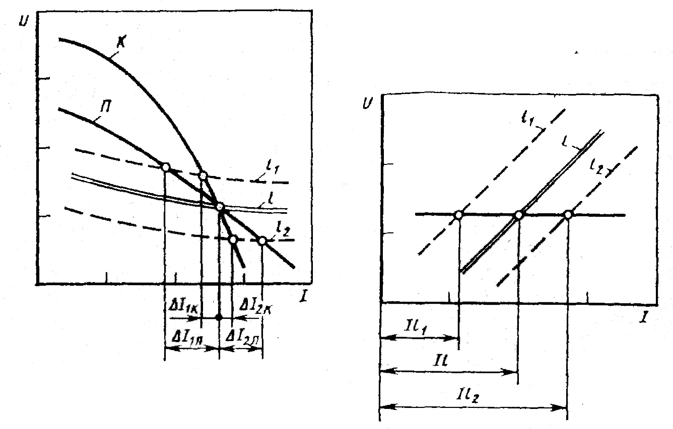 Рис. 4.3 - Влияние крутизны падения вольт-амперной характеристики источника на изменение сварочного тока (l, l1, l2 — длины дуг; l2 < l, l1> l К-крутопадающая; П-пологопадающая |