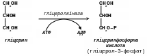 У нирках, а також в стінці кишечника, де активність ферменту гліцеролкінази висока, гліцерин фосфорилюється за рахунок АТФ з утворенням гліцерол-3-фосфату: