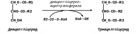 Потім 1,2-дигліцерид ацилюється третьою молекулою ацил-КоА і перетворюється на тригліцерид (триацилгліцерол). Ця реакція каталізує діацилгліцерол-ацилтрансферазою: