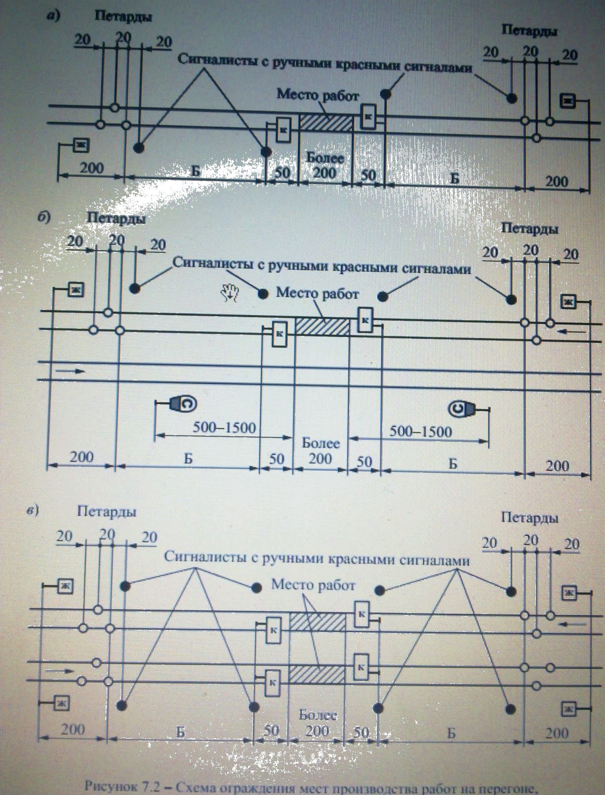 На перегоне: Места производства работ, требующие остановки поездов, при фронте работ 200 м и менее на однопутном участке, на одном из путей и на обоих путях двухпутного участка ограждаются сигналами остановки порядком, указанным на рисунке 2.1. На расстоянии 50 м от границ ограждаемого участка с обеих сторон устанавливаются переносные сигналы остановки, которые находятся под наблюдением руководителя работ. От этих сигналов на расстоянии Б укладывается по три петарды и на расстоянии 200 м от первой, ближайшей к месту работ петарды в направлении от места работ устанавливаются переносные сигналы уменьшения скорости. Переносные сигналы уменьшения скорости и петарды должны находиться под охраной сигналистов, которые обязаны стоять в 20 м от первой петарды в сторону места работ с ручными красными сигналами (днем с развернутым красным флагом, ночью с ручным сигнальным фонарем, красный огонь которого обращен в сторону ожидаемого поезда.При производстве работ развернутым фронтом (более 200 м) места работ ограждаются порядком, указанным на рисунке 2.2. В этом случае устанавливаемые на расстоянии 50 м от границ участка, требующего ограждения, переносные сигналы остановки должны находиться под охраной стоящих около них сигналистов с ручными красными сигналами.