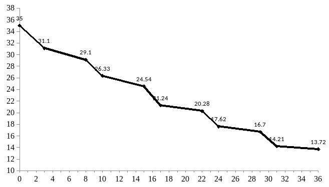 Рисунок 3.23 – Диаграмма сушки макаронных изделий из картофельного крахмала с добавлением КЭК и Е471 с использованием СВЧ-нагрева удельной мощностью 1,3 Вт/г