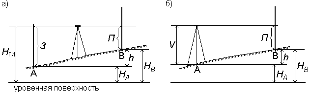 При нивелировании вперед прибор устанавливают над точкой А, измеряют его высоту V и берут отсчет П по рейке в точке В. Превышение определяют вычитанием из высоты прибора V отсчета П.