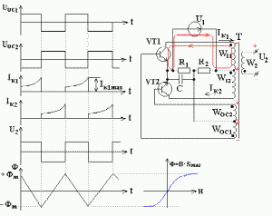 На рисунке представлена принципиальная схема транзисторного инвертора напряжения с насыщающимся трансформатором, где R1, R2 - создают смещение на базе транзисторов VT1 и VT2, работающих в ключевом режиме, конденсатор C - обеспечивает прохождение переменной составляющей напряжения обратной связи, обмотки WOC1, WOC2 - образуют цепь положительной обратной связи (ПОС) по напряжению для этого они включены согласно по отношению к обмоткам силового контура W11, W12.