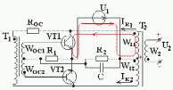 На рисунке представлена принципиальная схема транзисторного инвертора напряжения с насыщающимся трансформатором, где R1, R2 - создают смещение на базе транзисторов VT1 и VT2, работающих в ключевом режиме, конденсатор C - обеспечивает прохождение переменной составляющей напряжения обратной связи, обмотки WOC1, WOC2 - образуют цепь положительной обратной связи (ПОС) по напряжению для этого они включены согласно по отношению к обмоткам силового контура W11, W12.