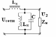 В цепях переменного тока более высоких мощностей применяются параметрические стабилизаторы на реактивных сопротивлениях: в качестве линейного элемента Zл используют обычно ненасыщенный дроссель L1, а нелинейного Zнл - насыщенный L2. Нагрузка подключается параллельно нелинейному элементу.