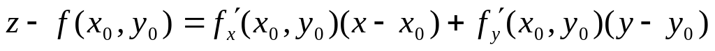 Если поверхность задана уравнением z = f(x, y), где f(x, y) – функция, дифференцируемая в точке М0(х0, у0), касательная плоскость в точке N0(x0,y0,(x0,y0)) существует и имеет уравнение: