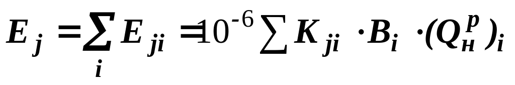 Валовий викид j-ї забруднюючої речовини Ej, т, що надходить в атмосферу з димовими газами енергетичної установки за проміжок часу, визначається як сума валових викидів цієї речовини під час спалювання різних видів палива, у тому числі під час їх одночасного спільного спалювання: