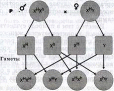 Эти заболевания наследуются в сцепленном с полом виде. Наследование гемофилии показано на примере брака женщины, имеющей ген, обусловливающий гемофилию (XHHh), и здорового мужчины (ХНУ) на следующей схеме.