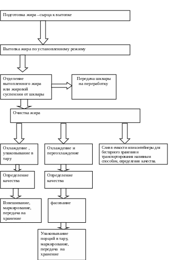 Жир-сырец передают в жировой цех на переработку рассортированным по видам скота и анатомическому признаку. Жировое сырье в соответствующих производственных цехах, накапливающееся в течение 2-3ч, развешивают на вешалах или помещают в холодную воду.