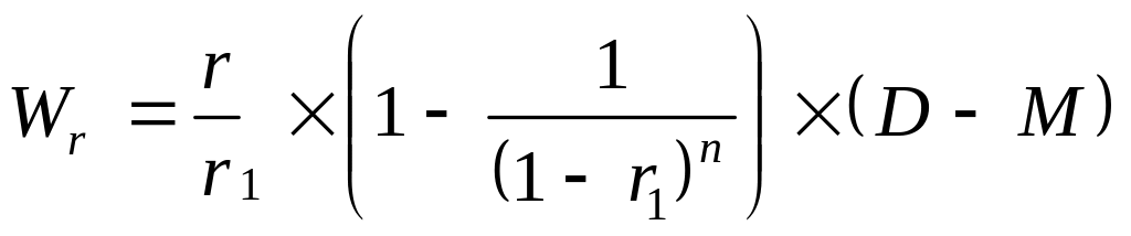 де Wr — вартість репутації; М — вартість майна підприємства, що складається з перелічених вище складових; D — дисконтована величина майбутніх прибутків, яка дає змогу визначити сучасну вартість або фінансовий еквівалент майбутньої грошової суми, тобто зменшити його на дохід, наростає за певний строк за правилом складних процентів.
