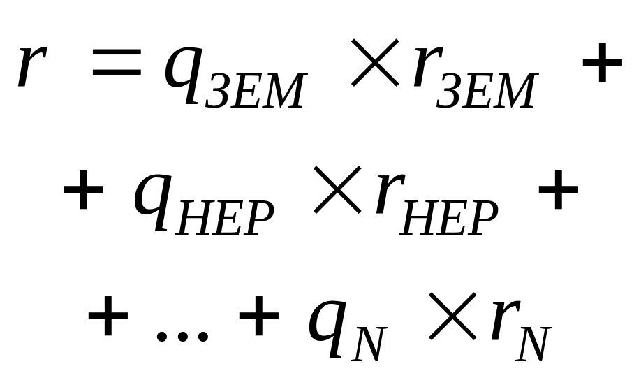 де qЗЕМ — частка вартості землі в загальній вартості об’єкта; rЗЕМ — ставка дисконту для землі; qНЕР — частка вартості нерухомості у загальній вартості об’єкта; rНЕР — ставка дисконту для нерухомості; qN — частка вартості n-го елемента в загальній вартості об’єкта; rN — ставка дисконту для n-го елемента |