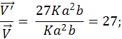 После уменьшения объема гомогенной системы в три раза концентрация каждого из реагирующих веществ увеличится в три раза: [SO2] = 3а; [O2] = 3б; [SO3] = 3с. При новых концентрациях скорости V' прямой и обратной реакций: