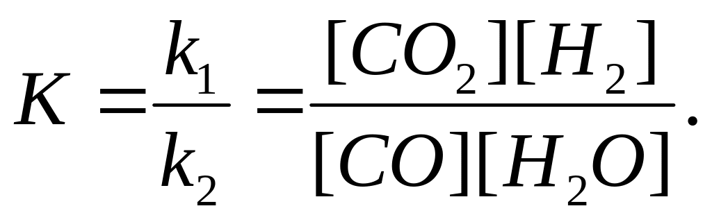 Решение. При равновесии скорости прямой и обратной реакций равны, а отношение констант этих скоростей есть величина постоянная и называется константой, равновесия данной системы K: