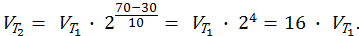Пример 5. Вычислите, во сколько раз увеличится скорость реакции, протекающей в газовой фазе, при повышении температуры от 30 до 70 °С, если температурный коэффициент реакции равен 2.