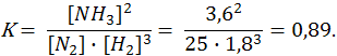 равновесные концентрации азота, водорода и аммиака соответственно равны 2,5; 1,8 и 3,6 моль/дм3. Вычислите константу химического равновесия этой реакции (K) и начальные концентрации азота и водорода.