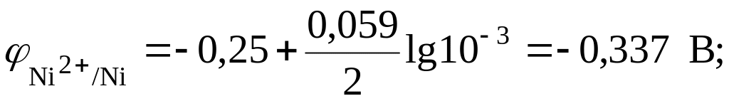 Для никеля и кобальта стандартные электродные потенциалы соответственно равны –0,25 и –0,277 В. Определим электродные потенциалы этих металлов при данных концентрациях растворов: