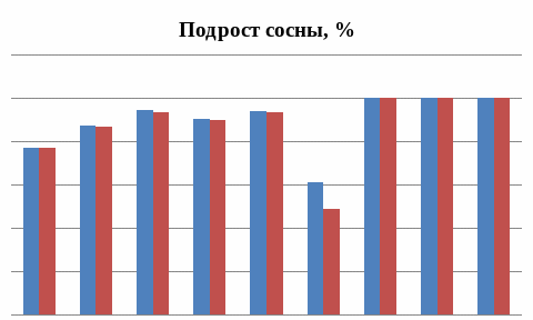Активное выращивание сосновых древостоев из подроста связано с целенаправленным проведением лесохозяйственных мероприятий и лесозаготовок. Действующие нормативные документы относят к мерам содействия естественному возобновлению лесов (сохранение подроста при рубках, минерализация поверхности почвы под пологом леса и на вырубках, огораживание, оставление семенников). Однако даже при щадящем и квалифицированном осуществлении главного пользования и применении указанных мер на опытных лесосеках подрост часто не становится основой нового поколения леса, отмирает по мере прохождения стрессовых стадий и периода адаптации к изменившимся условиям. Связано это с тем, что сохранившийся подрост очень сложен по возрастной и пространственной структуре, составу, неодинаков по состоянию, в целом ослаблен, подвергается влиянию значительного количества быстро сменяющихся биотических и абиотических факторов [8].
