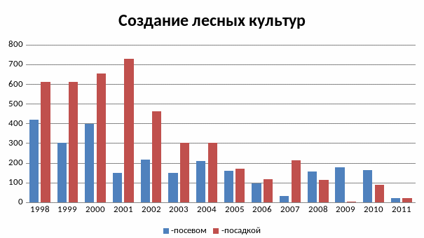 Из общего фонда лесовосстановления лесные культуры, созданные лесхозом за ревизионный период, составляют 16.2%. На долю содействия естественному возобновлению приходится 47% площади, требующей лесовосстановления.