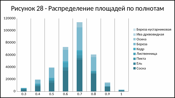 Высокополнотные древостои в лесхозе составляют 23,7 % лесопокрытой площади, среднеполнотные - 56,9 %, низкополнотные - 19,4 %.