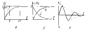На рис. 7.9, д приведены графики изменения uс и i при зарядке конденсатора. Как видим, и здесь переходный процесс заканчивается через (3÷4)τ.
