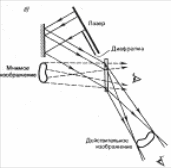Плоская монохроматическая волна, излучаемая лазером (рис. 9.3,а) попадает частично на зеркало, частично на фотографируемой предмет. Отражаясь от того и другого, лучи попадают на голограмму – светочувствительную пленку. Если затем посмотреть на изображение голограммы (рис. 9.3,б), предварительно убрав предмет, и ограничив диафрагмой плоской световой волны, направленной от лазера, на этот предмет, то увидим его либо мнимым (т. е. расположенным за фотопленкой), либо действительным (перед пленкой). Отличие голографического снимка от фотографического в том, что на нём предмет изображен стереоскопически.