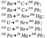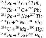 Как указывалось в предыдущем параграфе, ядра элементов, находящихся в конце таблицы Менделеева и состоящие из нескольких десятков нуклонов, в подавляющем большинстве неустойчивы. Входящие в их состав кластеры по случайным, стохастическим причинам могут вылететь из ядра. При этом меняются свойства соответствующего атома. Как правило, на смену одному атому какого-нибудь тяжелого элемента приходят два атома более легких элементов. Вот примеры таких распадов [13]: