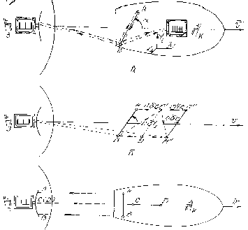 Как видим, такт «часов» АВ для наблюдателя с Земли зависит от угла их наклона α. И поэтому не может служить истинным измерителем времени. Исключить зависимость такта от α можно, полагая, что не только такт времени, но и масштаб расстояний зависит от скорости взаимного перемещения координат. При этом следует учесть, что при α = π/2 размер часов АВ представляется одинаковым и для наблюдателя З, и для К (рис. 1.8,в). Действительно, если из точек А и В космического корабля отправить параллельные лучи на Землю, то они воспроизведутся на экране земного локатора точно на таком же расстоянии друг от друга, как и на корабле. Зато при α = 0 сигналы от А' и В' сольются на принимающем локаторе в точку С (рис. 1.8,в). Следовательно, наблюдатель З сможет судить о масштабе линейных размеров на космическом корабле, параллельных скорости , косвенно, по разности прихода импульсов от точек А' и В'.