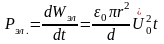 Плоский конденсатор, образованный круглыми электродами радиуса 0,5м, разделенными воздушным промежутком длиной 0,1м, медленно заряжают со скоростью 105 В/с. Определите мощность излучения электромагнитного поля через боковую поверхность конденсатора и сопоставить ее с приращени ем энергии конденсатора в единицу времени. Рассеянием электрического поля на краях конденсатора пренебречь.